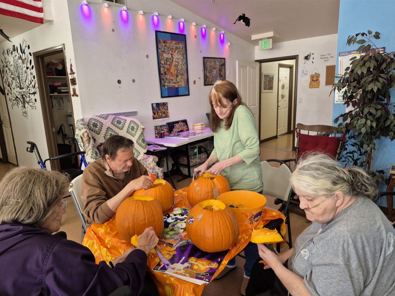Halloween is a very popular holiday in the U.S. and at Fremont Home Care. Our residents love the costumes and candies on the big day. And they extend the holiday by carving pumpkins in advance. On this day, four willing seed scoopers cut off the pumpkin tops and reached in to take out the gooey stuff. Then they set to work on carving the faces of their choice. What fun!